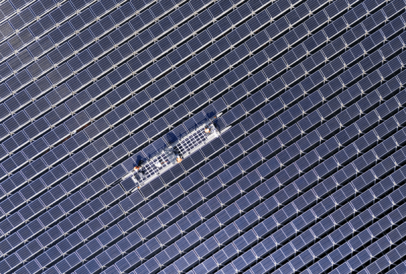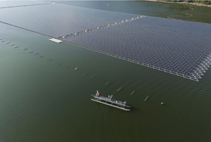 This specialized boat navigates directly over the floating solar structure, providing easy, fast, and secure access to every single PV panel, inverter, and cabling.